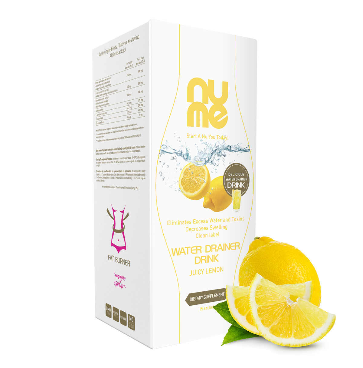 nuMe Water Drainer Drink Juicy Lemon contains 6 active ingredients which intensely eliminate excess water and toxins.