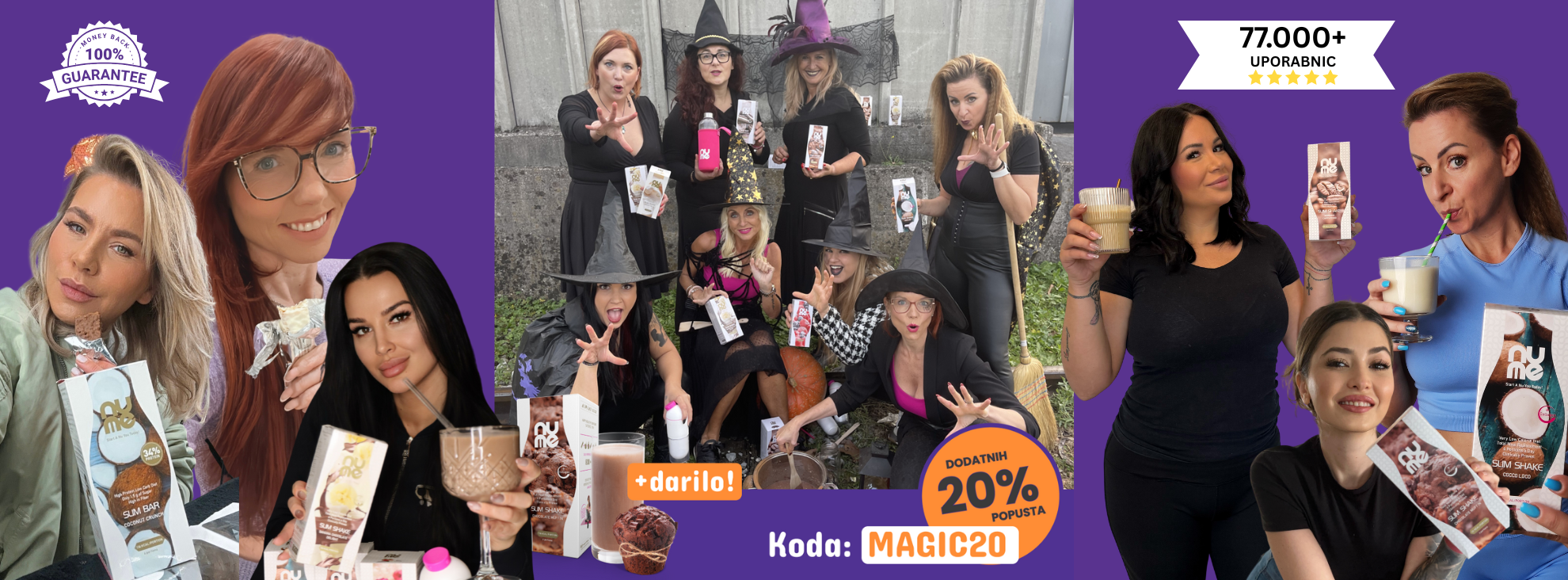Ustvarjena za sodobno žensko, ki si želi celovite spremembe življenjskega sloga, s tem, da ponovno na prvo mesto postavi svoje zdravje, um, dušo in telo. nuMe prehranski režim je eden najbolj učinkovitih in klinično potrjenih prehranskih režimov s 6 nuMe Slim obroki dnevno, ki so vam na voljo v odličnih ALL IN ONE Slim napitkih, Slim juhah in Slim ploščicah s kolagenom kot edini vir prehrane v zelo nizkoenergijskem vnosu (VLCD< 800 kcal). Omenjen prehranski režim vam zagotavlja izgubo 1,5 - 3 kg/teden, medtem ko vam vzdržuje vašo mišično maso. Zagotavlja vam 100% potrebni dnevni vnos vitaminov, mineralov in hranilnih snovi, ki jih vaše telo potrebuje v dnevnem prehranskem režimu, z vnosom minimalnega vnosa kcal. Vse skupaj vam je na voljo v glamuroznem, večnamenskem in okolju prijaznem pakiranju, ki se poda vašemu življenjskemu slogu in ga je oblikoval svetovno znani industrijski oblikovalec, Karim Rashid.